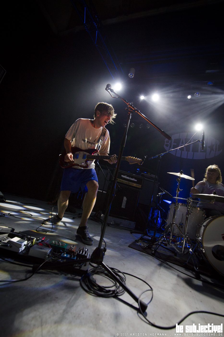 Bevor es aber zum Auftritt der Thurston Moore Group kommt, heizt das Trio Kala Brisella den Saal, sowohl im übertragenden als auch im genauso gemeinten Sinne mit ihrer Mischung aus Noise-Rock und Post-Punk, so richtig ein. Da es im Beatpol immer eine Stunde später losgeht, als in den meisten anderen Konzertveranstaltungslokalitäten, ist es kurz nach 21:00 Uhr schon rappelvoll und das ist bei bestem Sommerwetter und Schulferien keine Selbstverständlichkeit. Die Berliner stellen ihre Debüt-LP „Endlich Krank“ vor, vom selben Produzenten, der auch schon bei Die Nerven Hand angelegt hat. Das Thema Krankheit zieht sich ein bisschen wie ein roter Faden durch die Texte. Bis zur Tourankündigung habe ich von Kala Brisella noch nie etwas gehört und die Band überzeugt nicht nur mich, sondern auch alle anderen Anwesenden am Saal. Ein euphorisiertes, beifallbekundendes Publikum, ein würdigen Auftakt für diesen Konzertabend,