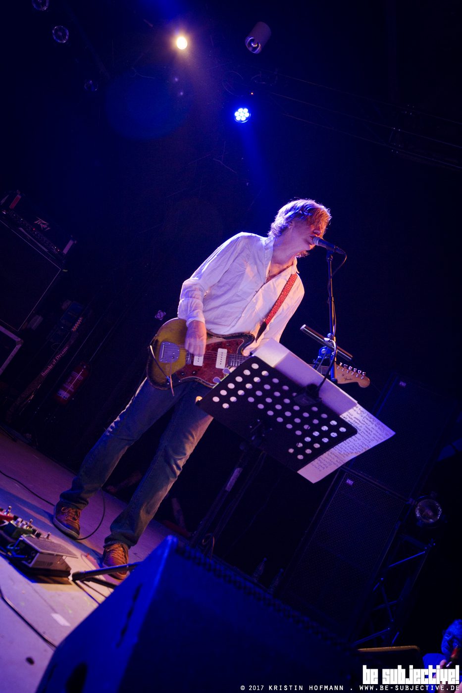 Schon nach dem ersten Song „Cease Fire“ wird deutlich, dass hier absolute Profis mit jahrzehntelanger Erfahrung am Werk sind, die weder viele Blicke noch Absprachen brauchen. Da konzentriert sich jede(r) mit Hingabe auf den jeweiligen Part. So sind ebenso Bühnendeko wie Licht sehr spärlich be- bzw. eingesetzt und dezent im Hintergrund gehalten. Schließlich geht es Moore nicht um eine protzige Rock’n’Roll-Show, sondern wie es der Albumtitel „Rock’n’Roll Consciousness“ schon vermuten lässt, um eine gewisse Erkenntnis, eine Vergegenwärtigung, Bewusstheit. So lenkt nicht viel Visuelles ab und jede(r) kann sich mehr auf den Hörsinn konzentrieren. Die Reise geht fast ausschließlich durch die Songs der neuen Platte, „Speak To The Wild“ der 2’14er Platte reiht sich sehr gut in die aktuellen Stücke ein. Nach jedem Track gibt es total begeisterten Applaus vom durchaus altersmäßig durchmischten Publikum. Von Anfang 20 bis Ü60 ist alles vertreten. Vereinzelt etwas zu vorschnell, weil nicht immer ganz klar ist, ob sich ein Song noch Mal aufbaut oder dann doch zu Ende ist. Kein Wunder, die neue Scheibe „Rock’n’Roll Consciousness“ beinhaltet zwar ’nur‘ fünf Tracks, da ist der Kürzeste aber sechs Minuten lang und der Längste fast zwölf. Eine der wenigen Ansprachen ans aufmerksame Auditorium beinhaltet eine Widmung für die Vorband Kala Brisella, was vermuten lässt, dass sich Moore diese für seine Deutschland-Termine bewusst rausgesucht hat. Das letzte Stück „Exalted“ fasst alles bisher Gehörte so richtig schön zusammen, es beginnt behutsam mit dem Aufbau und explodiert dann regelrecht nach einigen Minuten und beruhigt sich zum Schluss wieder, bis der Song anschließend in sich zusammen fällt.