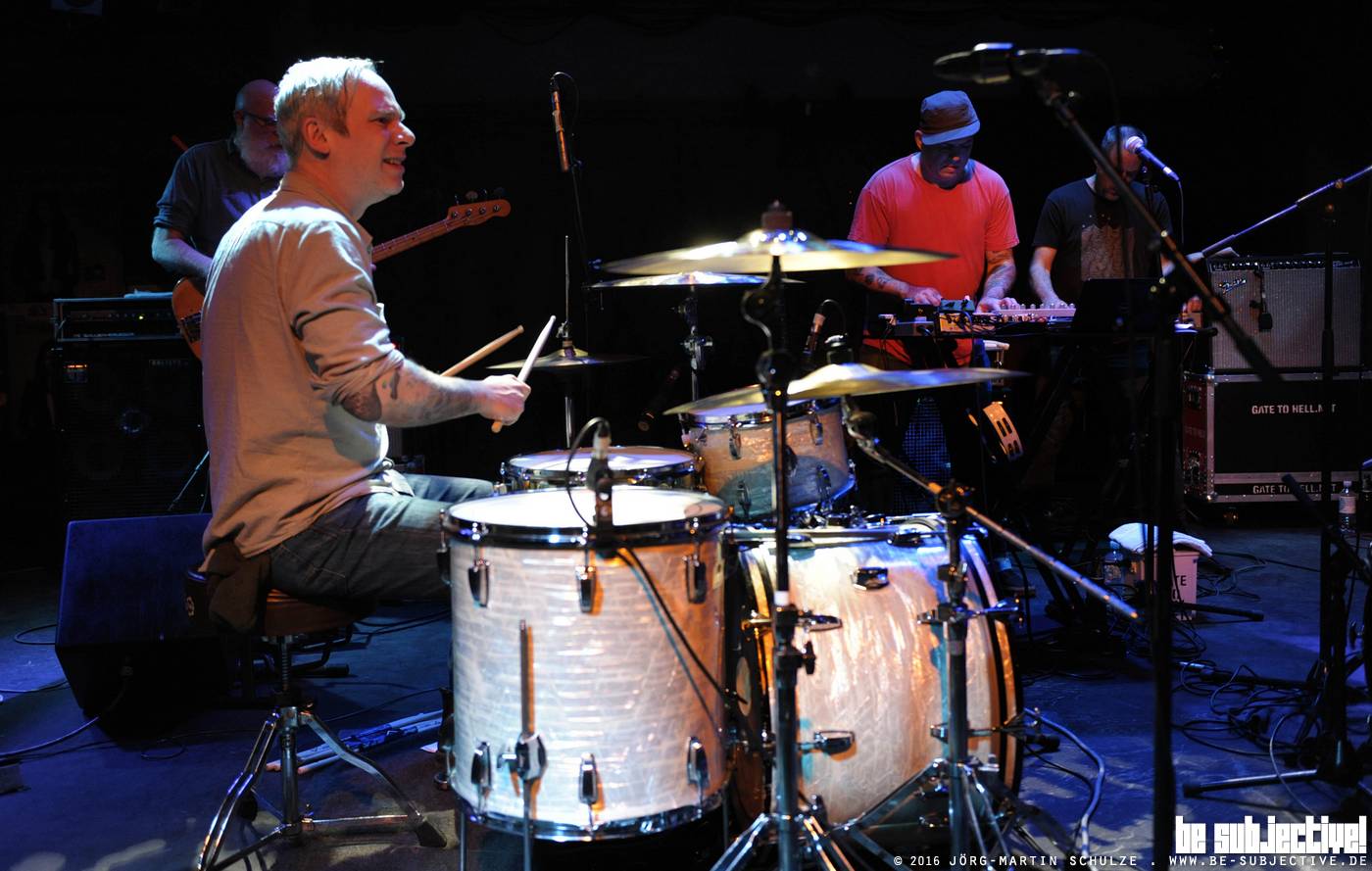 Was 1988 als Simple begonnen hatte, ’92 in Tortoise umbenannt wurde, ist nun schon seit fast 25 Jahren als Formation unterwegs, um den Leuten auf der ganzen Welt einem ganz speziellen Klangkosmos live darzubieten. Jede/r, die/der die Band aus Chicago schon ein Mal erlebt hat, will dies erneut tun, denn jedes Konzert ist wirklich etwas Einmaliges. Jede/r Rookie ist sofort infiziert und wird Tortoise ebenso wieder anschauen wollen, weil ihre Shows eine einzig geile Jam-Session im Perfect-Mode mit Punk-Attitude sind. Also unbedingt bei nächster Gelegenheit hingehen und hier erst Mal die Fotos ansehen.