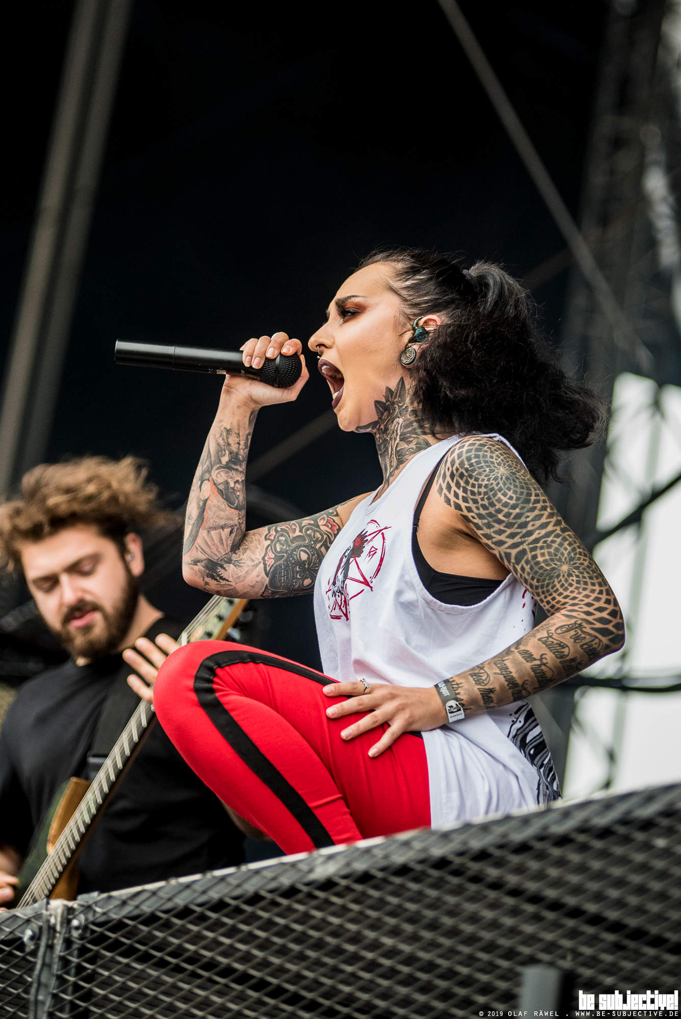 Im Zentrum steht Frontfrau Tatiana Shmayluk, deren Stimme längst zu einem Markenzeichen der Band geworden ist. Mühelos wechselt sie zwischen tiefen Growls, aggressiven Shouts und klaren, emotionalen Gesangslinien. Dabei wirkt nichts kalkuliert – ihre Performance ist intensiv, direkt und voller Ausdruck. Jinjer transportieren ihre Inhalte nicht nur musikalisch, sondern auch körperlich auf die Bühne.