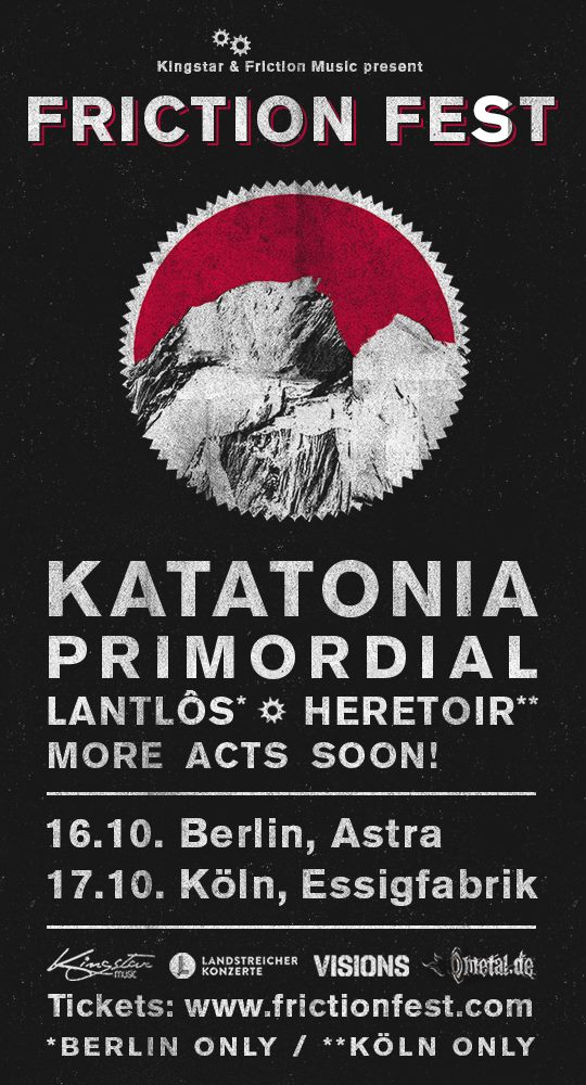 Nach fast fünfjähriger Pause findet das Friction Fest erstmalig als Ein-Tages-Event in Berlin und Köln statt. Kingstar und Landstreicher Konzerte als gemeinsamer Veranstalter haben bereits erste Künstler bestätgt: KATATONIA, PRIMORDIAL, LANTLÔS, HERETOIR.
