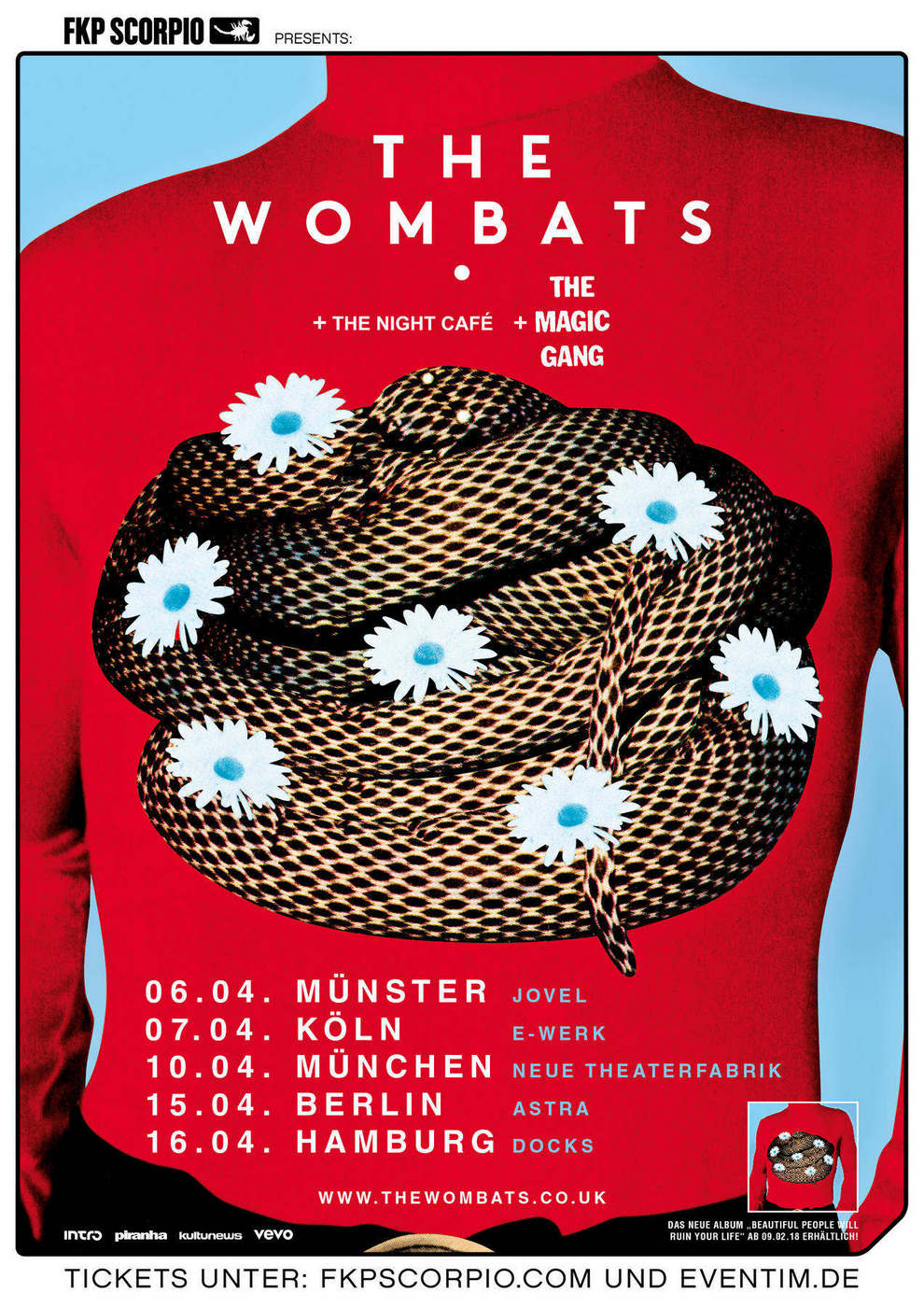 Im Februar werden The Wombats beweisen, dass sie immer noch zu den besten und größten Indie-Gitarren-Bands unserer Zeiten zählen: Dann nämlich erscheint das vierte Album „Beautiful People Will Ruin Your Life“, bereits jetzt kursiert mit der Vorab-Single „Lemon To A Knife Fight“ eine geradezu klassische UptempoNummer, inhaltlich eine Achterbahnfahrt zwischen Euphorie und Verzweiflung, musikalisch ein Floorfiller in jedem Indie-Club.