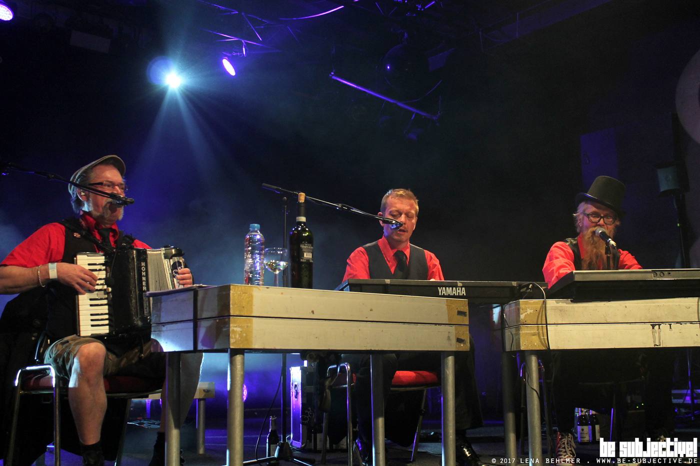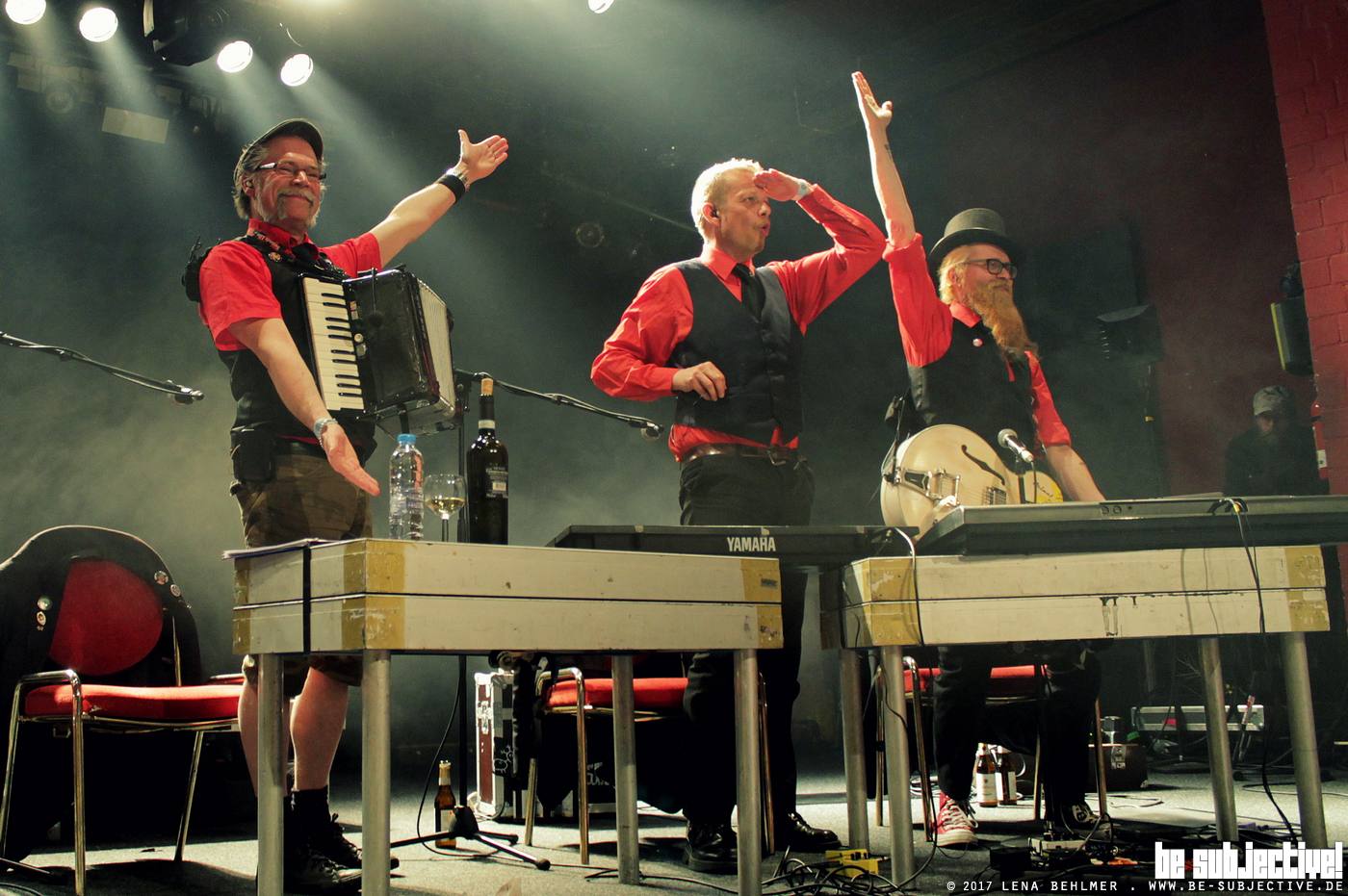 Die Spielfreude der Band überträgt sich sofort auf das Publikum und mensch fühlt sich, wie auf einer alkoholgeschwängerten finnischen Party, die einfach kein Ende kennt. Mittlerweile kocht die Stimmung fast über, während der neue Track „Karannut humppa“ seine Berlin-premiere erlebt. Die Tracklist beinhaltet einen Querschnitt durch die gesamte Karriere von Eläkeläiset. Angefangen von „Tervetuloa mehtään“ des ersten echten Albums der Finnen bis hin zu „Humppaprinsessa“ vom aktuellen Album „Humppa of Finland“, stellen die Herren das „Astra-Kulturhaus“ sprichwörtlich auf den Kopf.